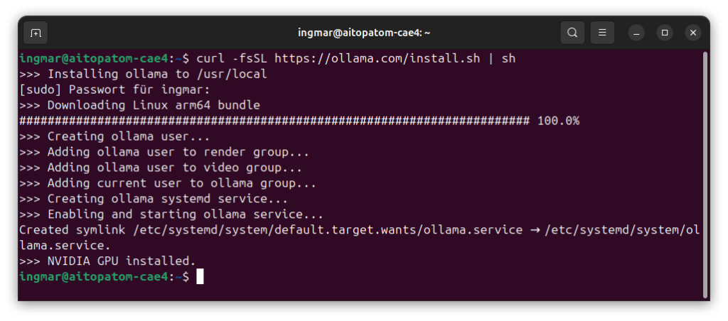The script downloads the latest version and installs both the Ollama binary and the service components. The beauty here is that Ollama was provided specifically for the NVIDIA platform. So the command is the same for both the x86 world and the ARM world. I simply wait until the installation is complete – it usually only takes a few minutes. The output will then show you that everything was successfully installed.