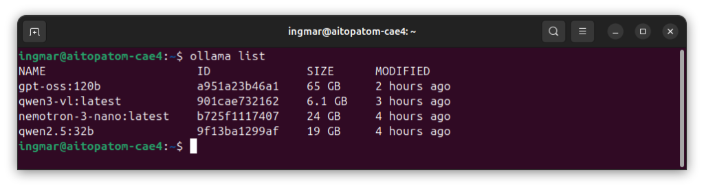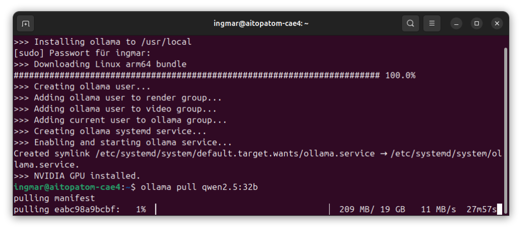 After the installation, I download a language model. For the Blackwell GPU on the AI TOP ATOM, I recommend Qwen2.5 32B, as this model is specifically optimized for the Blackwell architecture and fully utilizes the GPU performance. The following command downloads the model and then makes it available in Ollama itself.