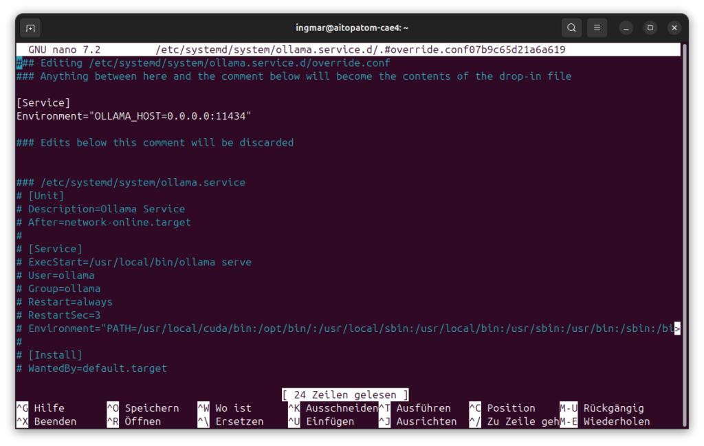 The configuration OLLAMA_HOST=0.0.0.0:11434 means that Ollama listens on all network interfaces on port 11434. I save the file and restart the Ollama service: