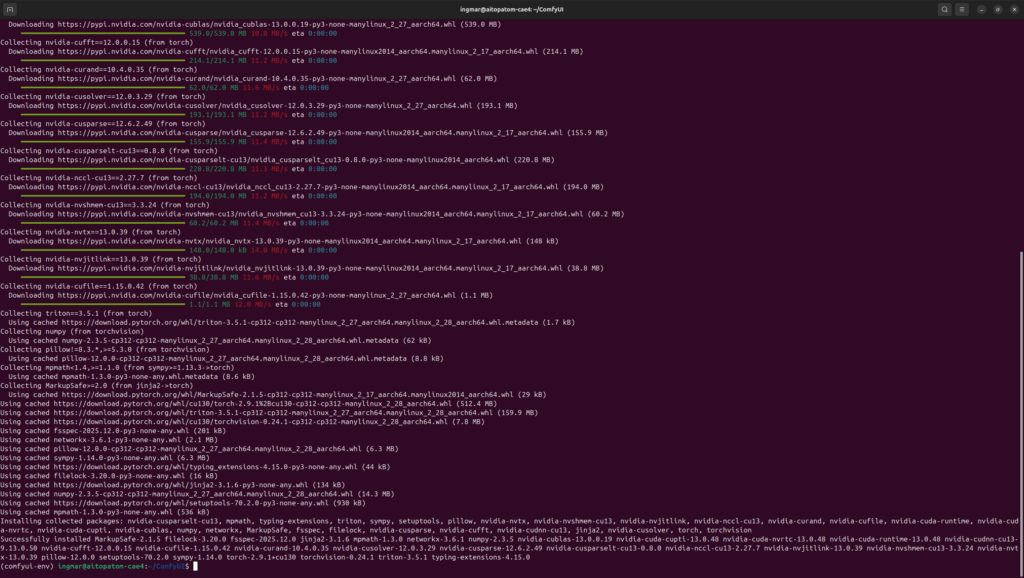 This installation can take a few minutes as PyTorch is a large package. I just let the download run and do something else in the meantime. The installation is specifically optimized for CUDA 13.0, which works perfectly with the Blackwell architecture.