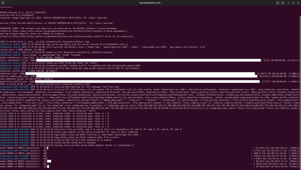 Now I start the vLLM server with a test model to check the basic functionality. I am using the small openai/gpt-oss-20b model for the first test. In the Phase 4 section, I will go into much more depth regarding Docker parameters and configurations.