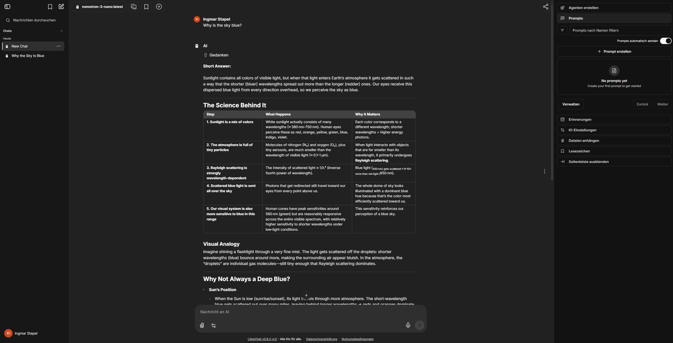 Öffnet im Browser: http://<IP-ADRESSE-ATOM>:3080 (oder http://localhost:3080). Erstellt den ersten Account (dieser wird automatisch Admin). Unter den Modellen findet ihr nun eure Ollama-Instanzen. Ein kurzer Test wie „Warum ist der Himmel blau?“ zeigt euch sofort die Power der lokalen GPU-Beschleunigung.