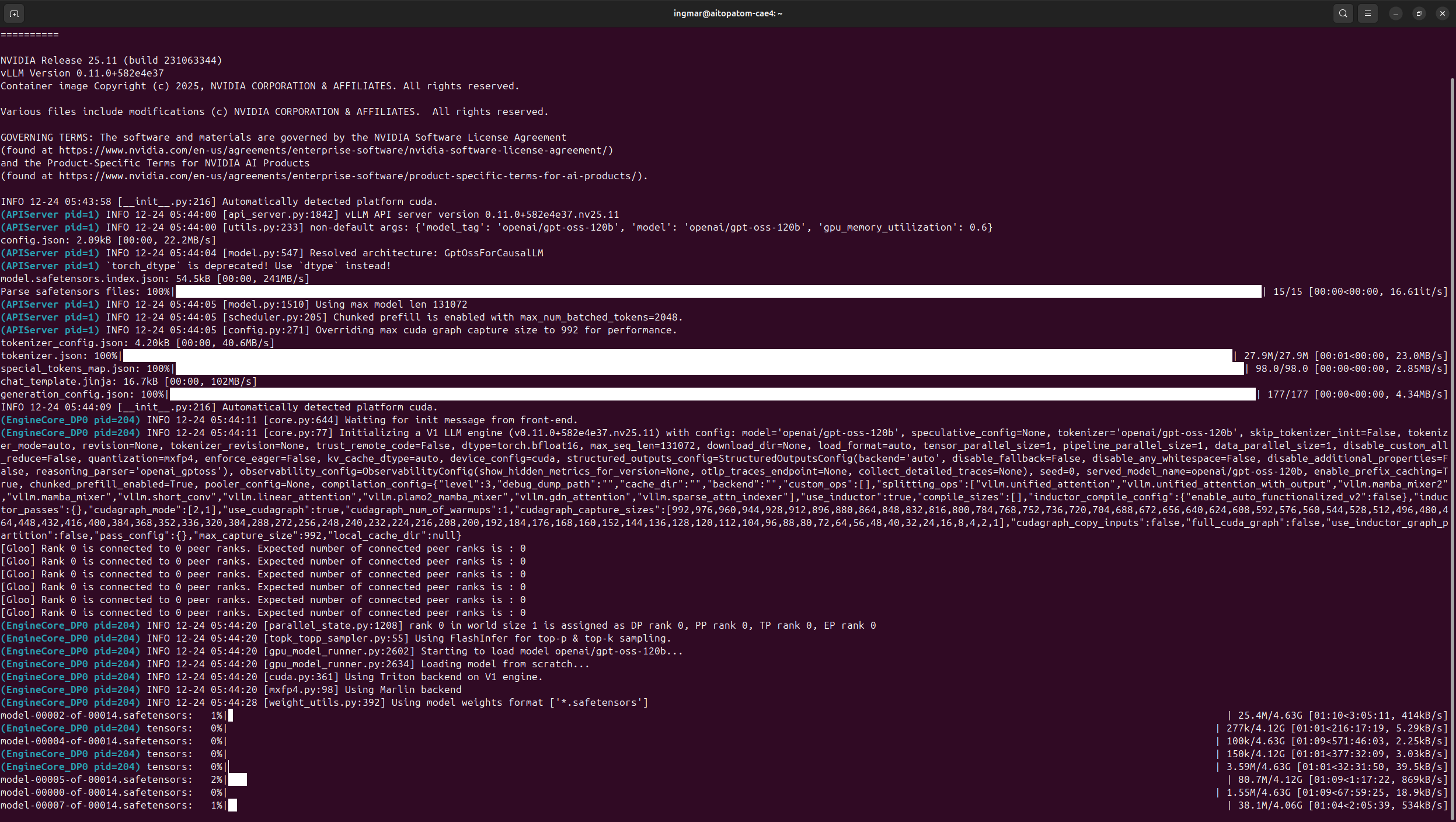 Befehl: docker run -it --gpus all -p 8000:8000 nvcr.io/nvidia/vllm:25.11-py3 vllm serve "openai/gpt-oss-20b"