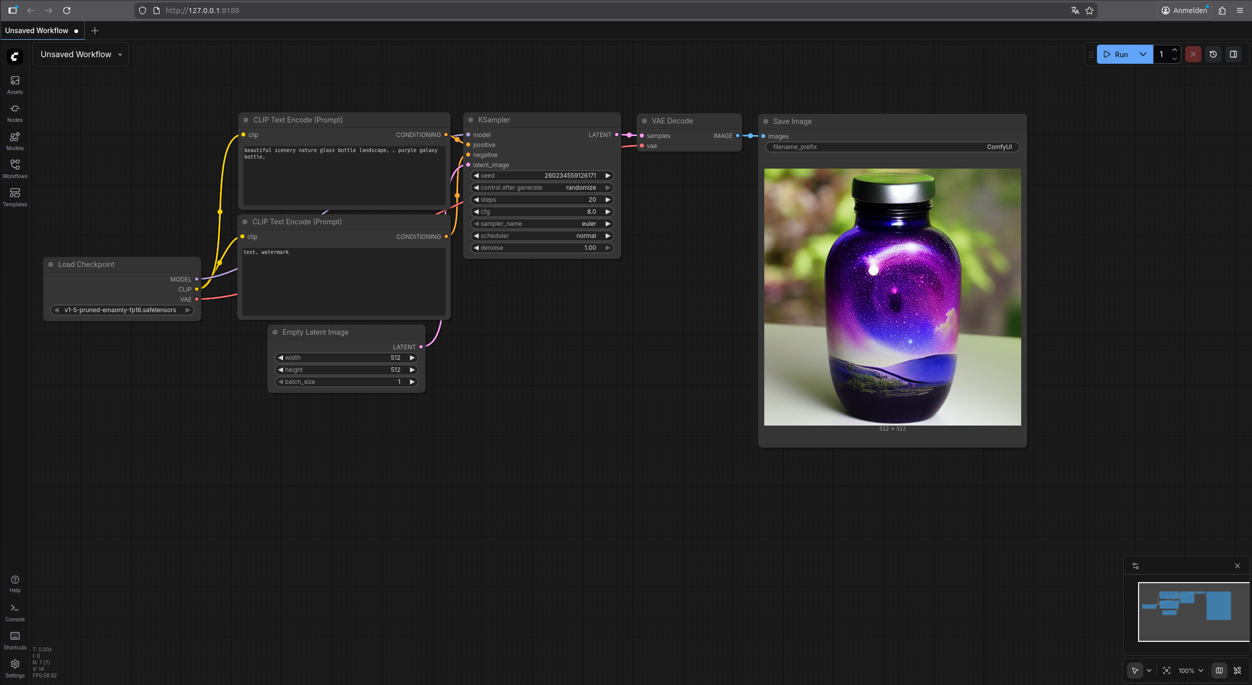 Wenn die ComfyUI Oberfläche geladen ist, seht ihr eine node-basierte Oberfläche. Standardmäßig sollte bereits ein einfacher Workflow geladen sein. Um euer erstes Bild zu generieren: