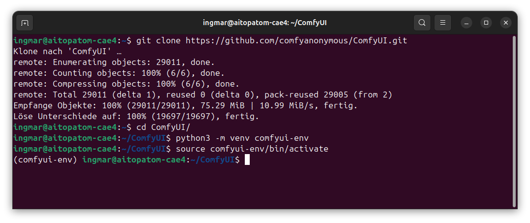 (comfyui-env)zeigen. Falls nicht, führtsource comfyui-env/bin/activateaus. -