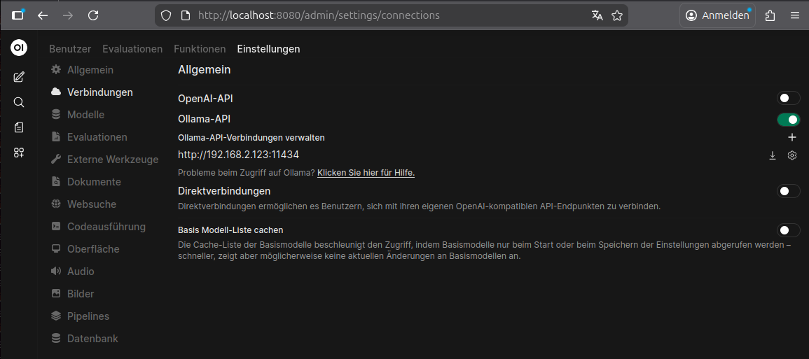Jetzt müsst ihr unter den Einstellungen von Open WebUI noch die Verbindung zu eurer Ollama-Installation herstellen. Das macht ihr wie folgt.